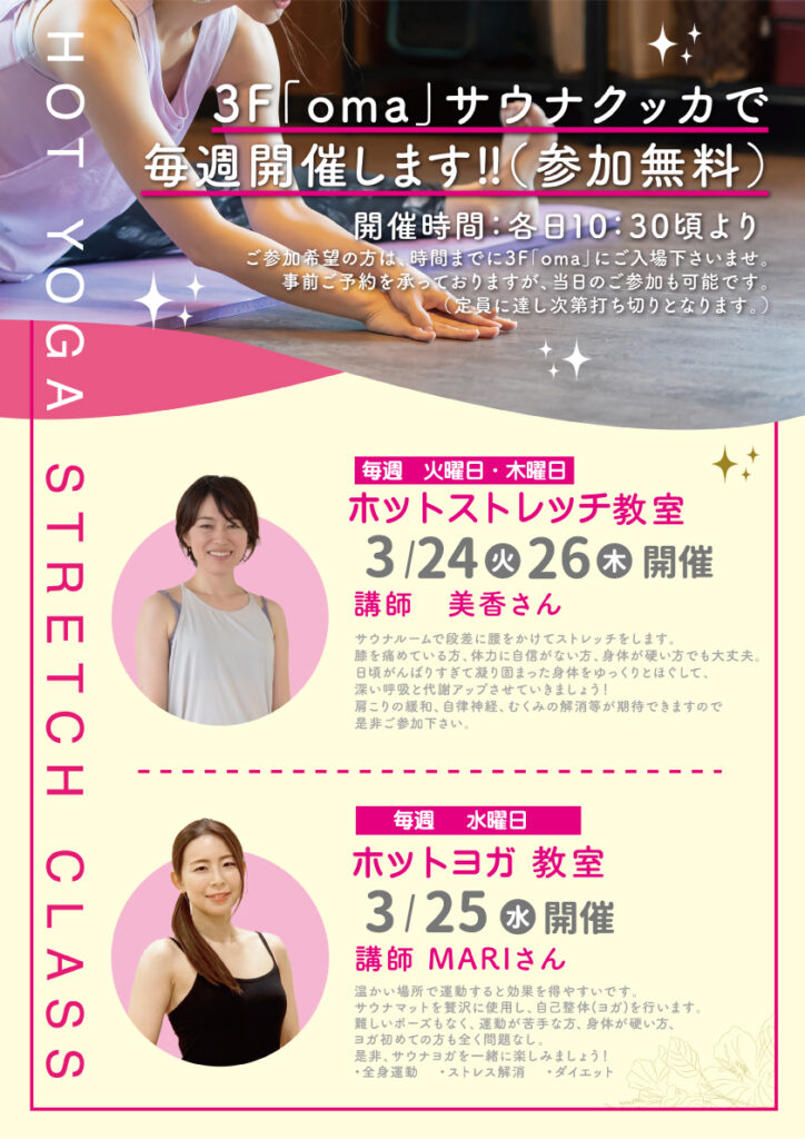 ホットストレッチ・ホットヨガ教室のお知らせ。