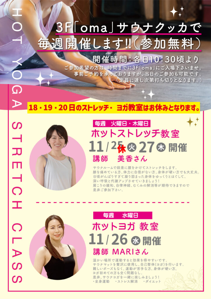 • ホットストレッチ・ヨガ教室のお知らせ。